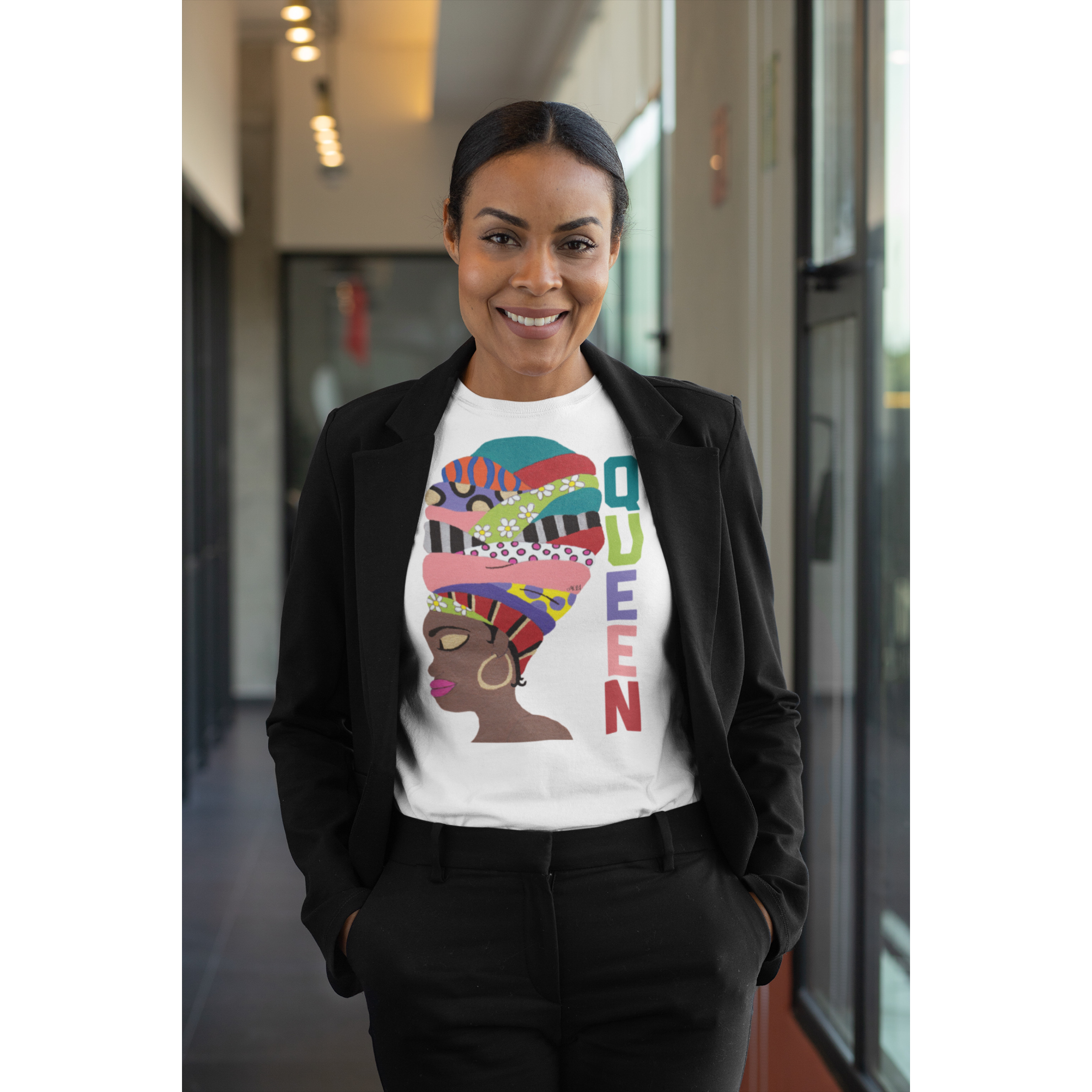 Her name is Queen Harriet, because her headwrap is a crown and because the admirable and phenomenal American abolitionist and political activist, Harriet Tubman, is often recognized for wearing a head scarf.